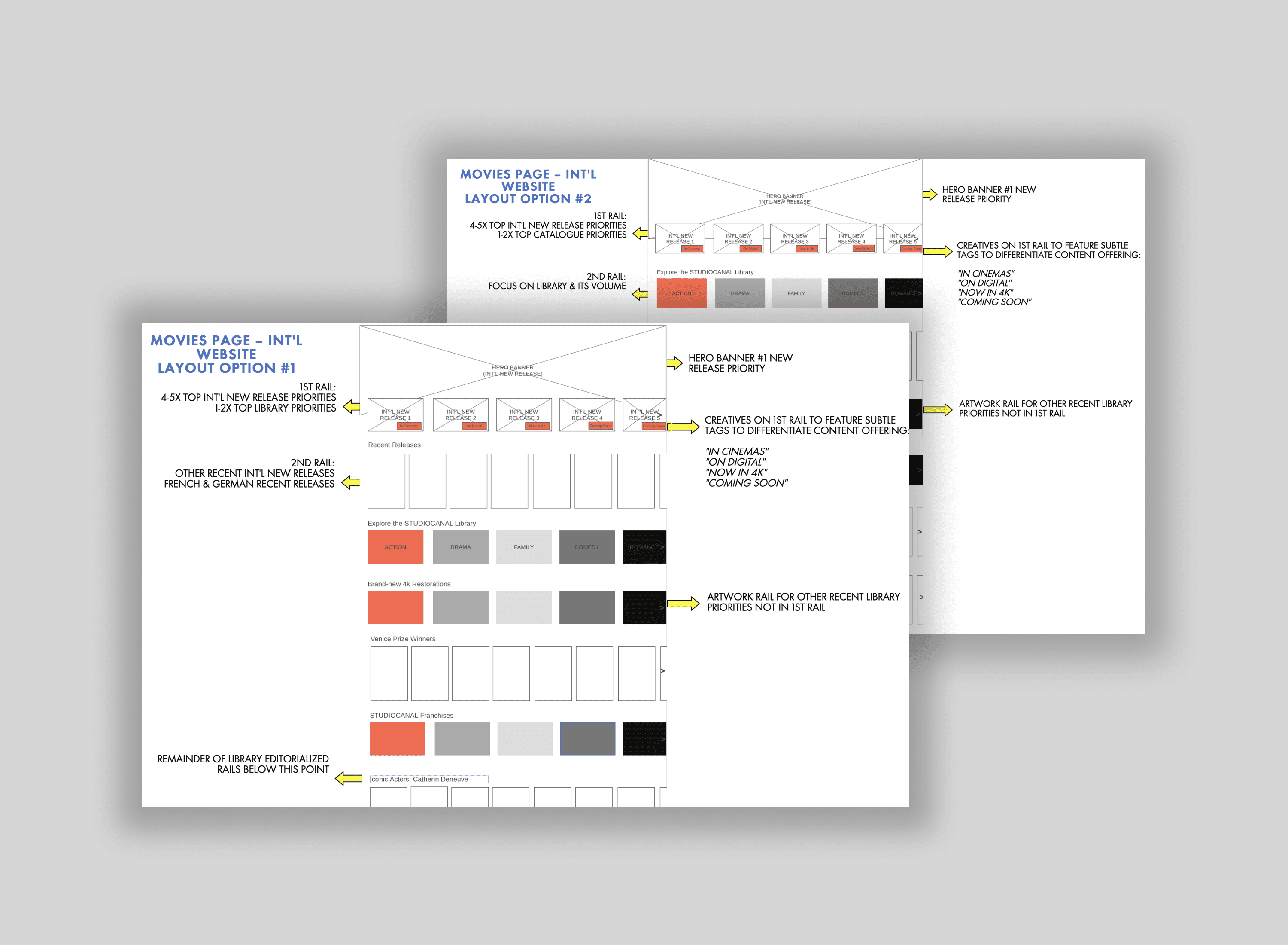 After a competitive benchmark, a detailed content analysis, and input from all key marketing and publicity team stakeholders, I took the newly-established requirements and proposed a refreshed website structure and interface that matched users' established mental models of modern entertainment platforms — a clean, curated, content-driven approach.